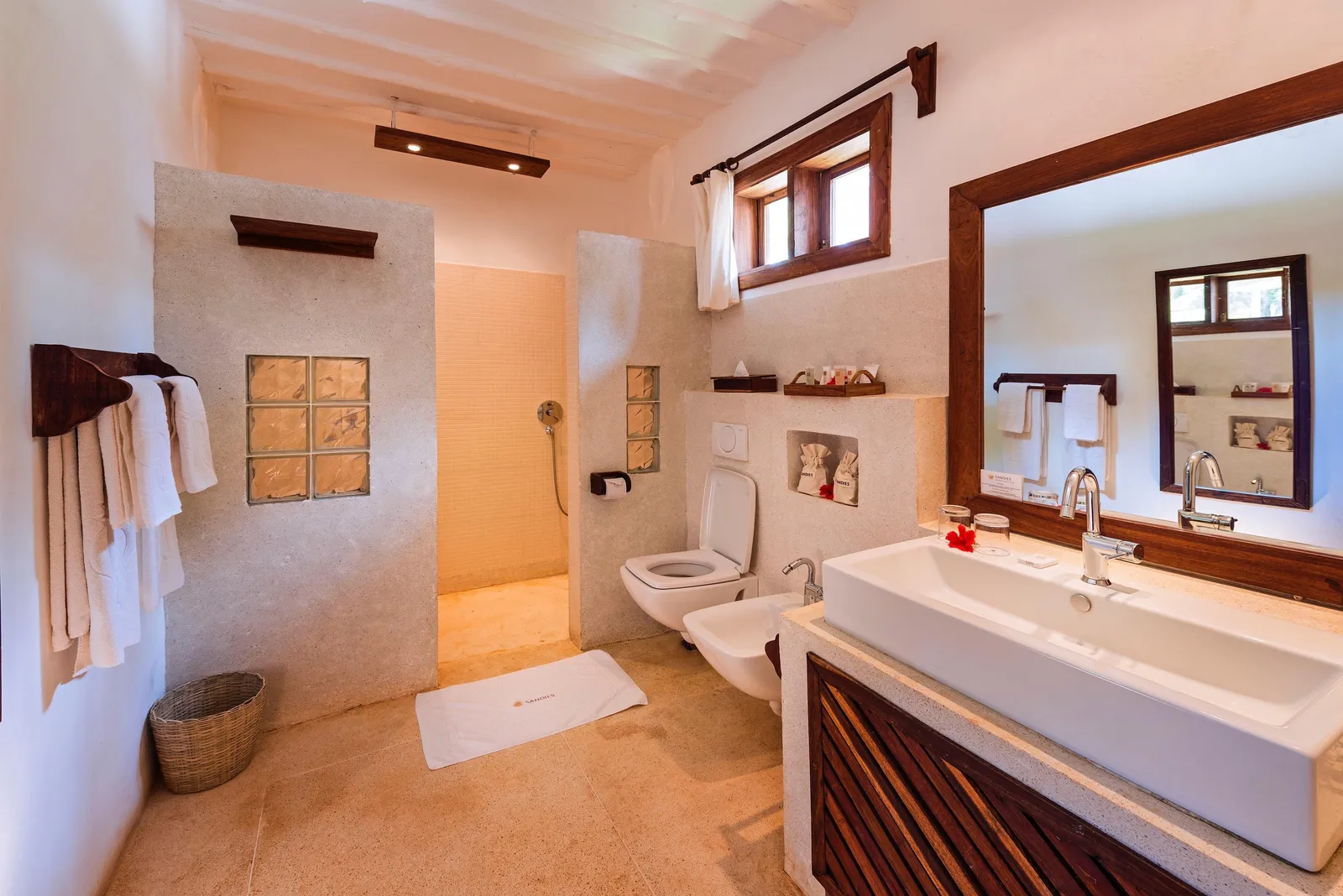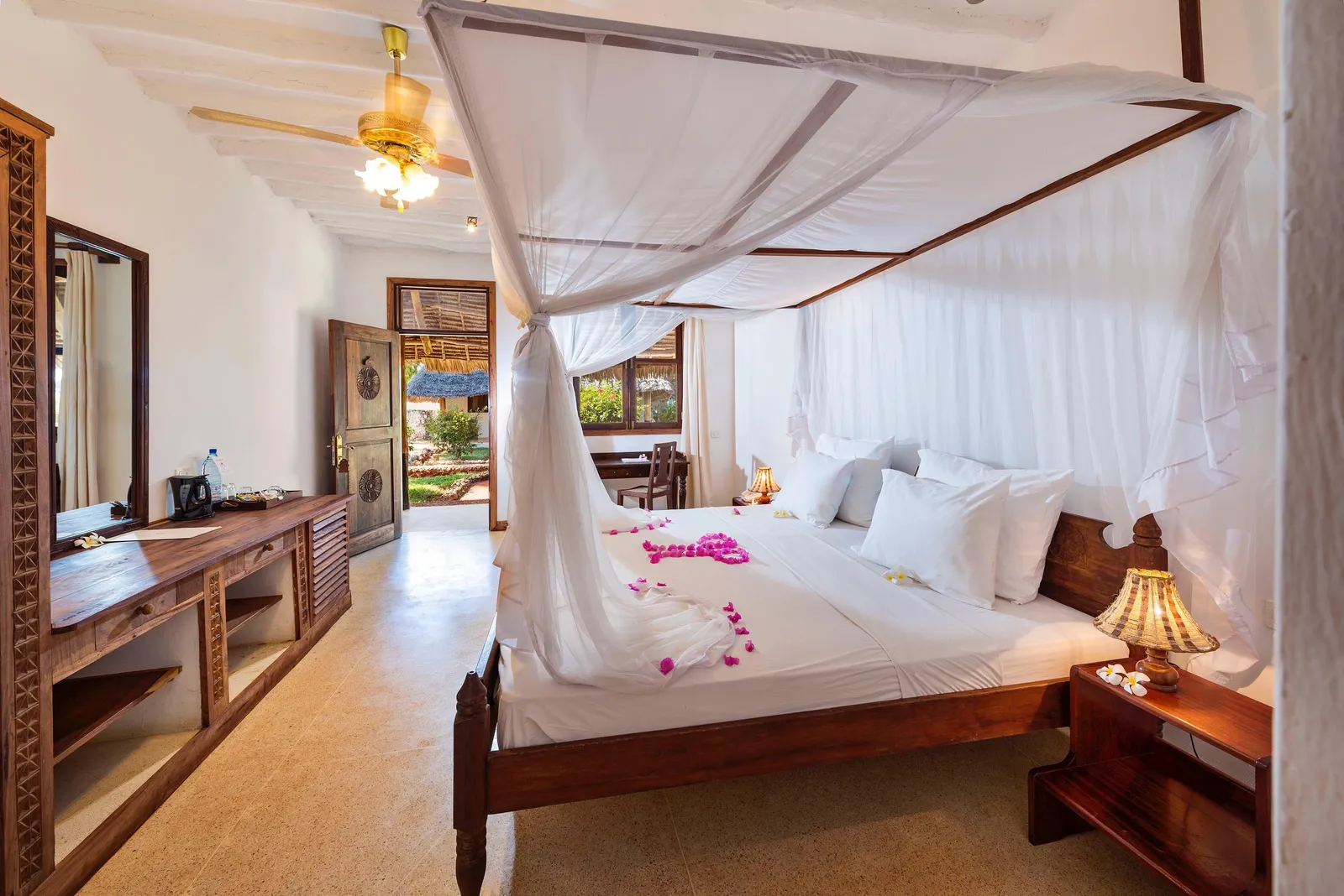 - Dvoulůžkový pokoj, Výhled do zahrady: s kúpeľňou/WC, manželskou posteľou alebo dvoma oddelenými lôžkami, moskytiérou, klimatizáciou, stropným ventilátorom, telefónom, trezorom, minibarom, ktorý je dopĺňaný na požiadanie, a terasou.