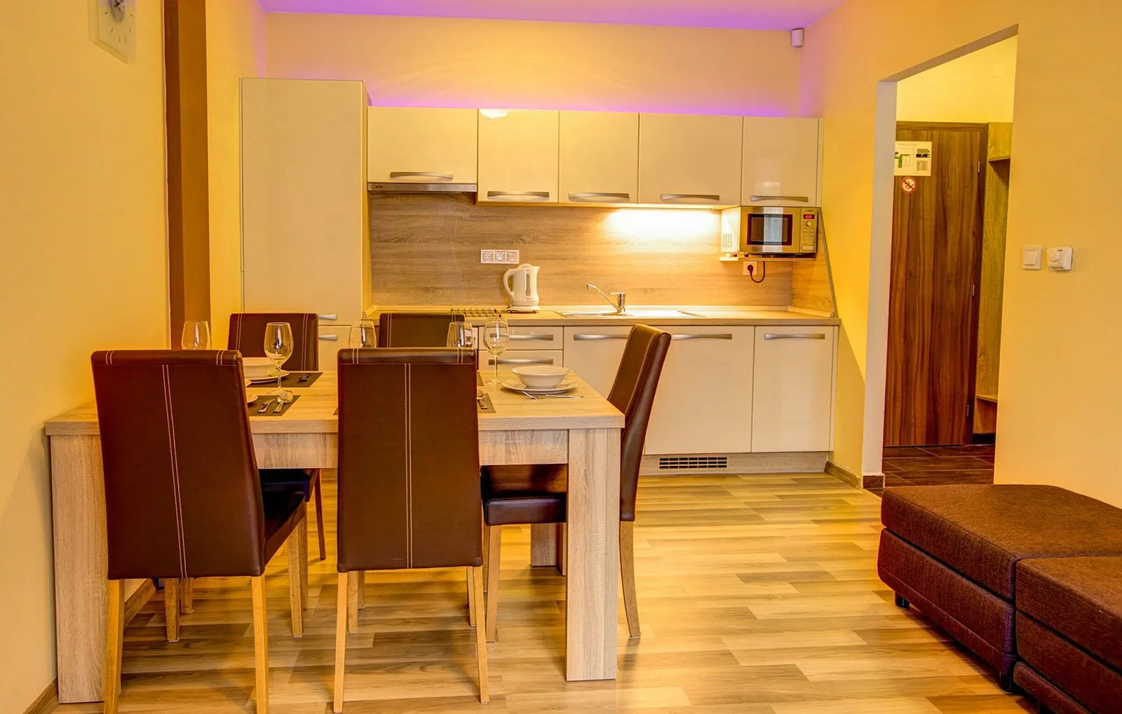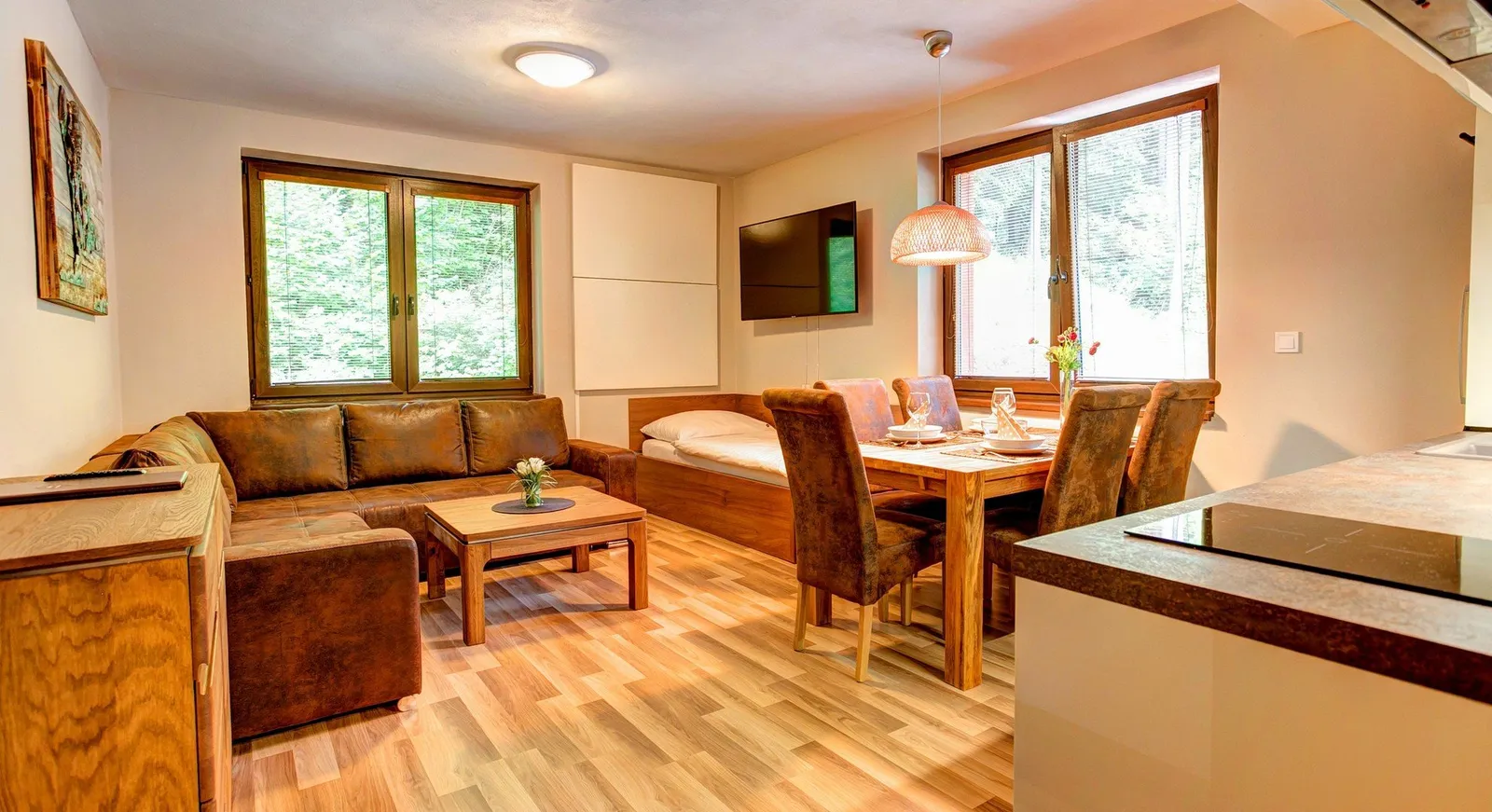 Apartmány sú elegantne a štýlovo zariadené, pričom každý z nich disponuje vlastným parkovacím miestom, a parkovanie je možné aj v garáži. K dispozícii sú plne vybavené kuchyne, kúpeľne s toaletou, a balkóny s posedením, kde si hostia môžu vychutnať výhľad na okolitú prírodu. Apartmány sú vybavené satelitnou televíziou, bezplatným wifi pripojením a trezorom na osobné veci, čo zabezpečuje pohodlný a bezstarostný pobyt.