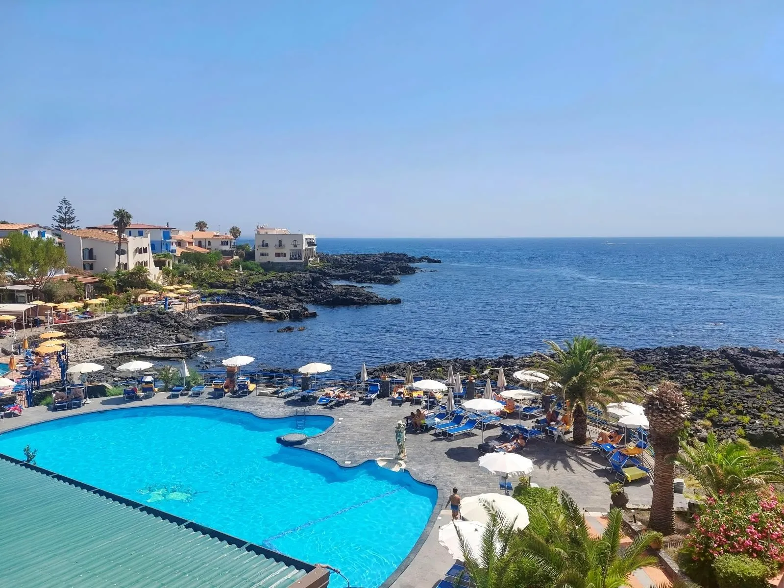 Pláže: Priamo pred hotelom sa nachádza skalnatá pláž len asi 100 metrov od jeho dverí, s prístupom k slnečnej terase a bezplatným lehátkam; k moru sa dá dostať po schodoch. Verejná piesočná pláž Giardini Naxos je vzdialená zhruba 500 metrov, kde sú lehátka a slnečníky dostupné za poplatok.