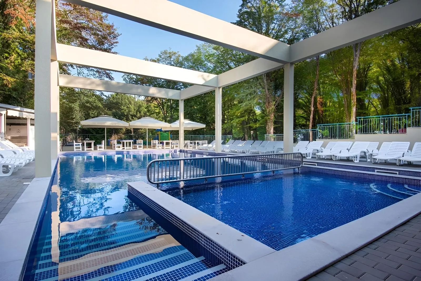 - Außenpool mit Kinderbereich und Sonnenschirmen