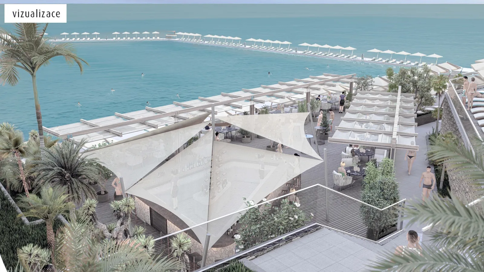 - Súkromná piesočná platforma a dve móla s ležadlami a slnečníkmi