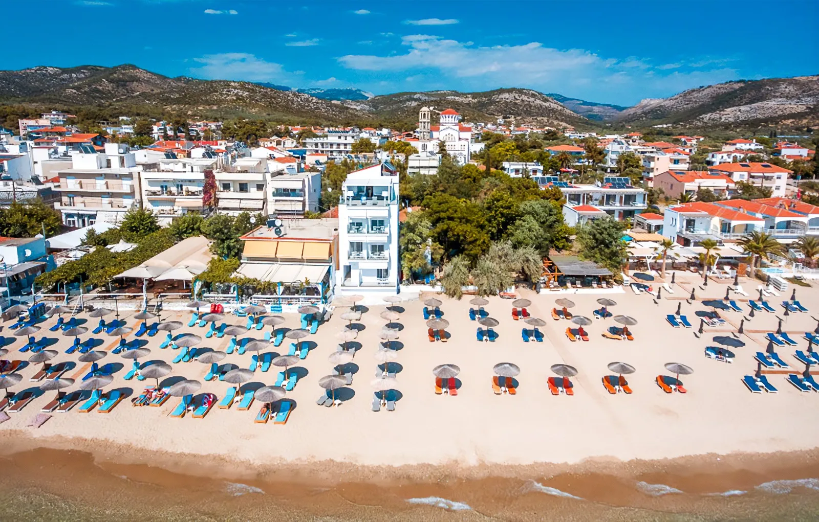 Moderný hotel priamo pri piesočnej pláži Potos, len pár krokov od centra letoviska — perfektná voľba pre tých, ktorí hľadajú pohodlie, jednoduchý prístup k moru a príjemnú dovolenkovú atmosféru.