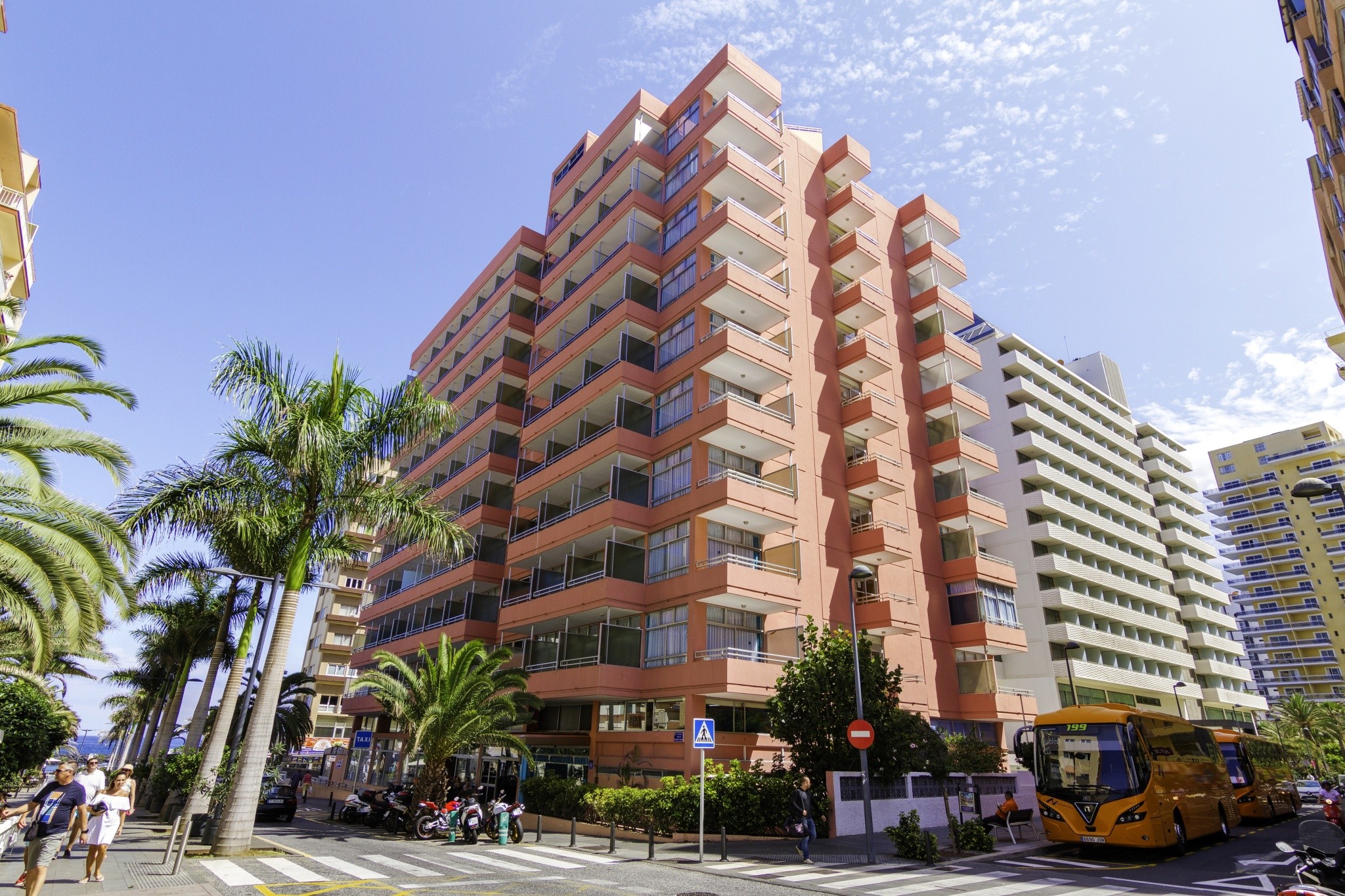 V bezprostrednom okolí hotela sa nachádza množstvo barov, reštaurácií a obchodov, ktoré dodávajú tejto lokalite živú atmosféru. Vstupná hala hotela je vybavená recepciou, výťahmi a spoločenskými priestormi s televíziou. Vonku sa nachádza bazén, bar pri bazéne a terasa s lehátkami a slnečníkmi, ktoré sú dostupné bez poplatku. Osušky sú k dispozícii za malý depozit.