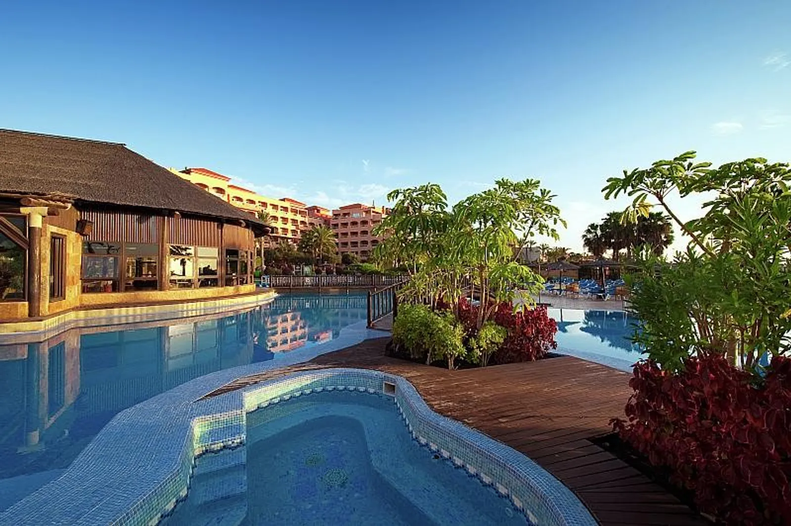 V prekrásne udržiavanej subtropickej záhrade sa nachádzajú dva bazény, pričom jeden je možné počas zimných mesiacov kúriť alebo klimatizovať. Deti môžu využívať samostatný detský bazén. Slnečná terasa s lehátkami a slnečníkmi je pre hostí k dispozícii bez poplatku; balibedy sa dajú prenajať za poplatok 10 €.