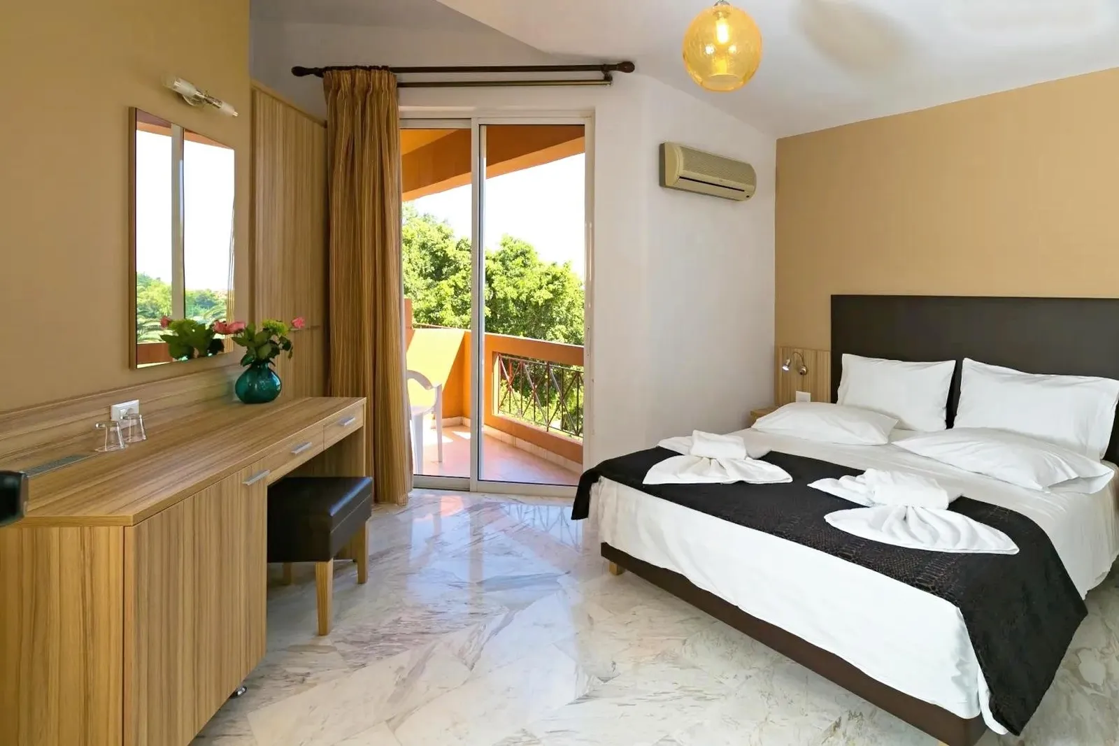 Izby sú comfortne zariadené, pričom dvojlôžkové a trojlôžkové jednotky majú vlastnú kúpeľňu so WC, klimatizáciu, miestne televízne kanály, telefón, trezor (za príplatok), chladničku, ako aj set na prípravu čaju a kávy. Každá izba disponuje balkónom alebo terasou, z ktorej sa ponúka krásny výhľad na okolie.
