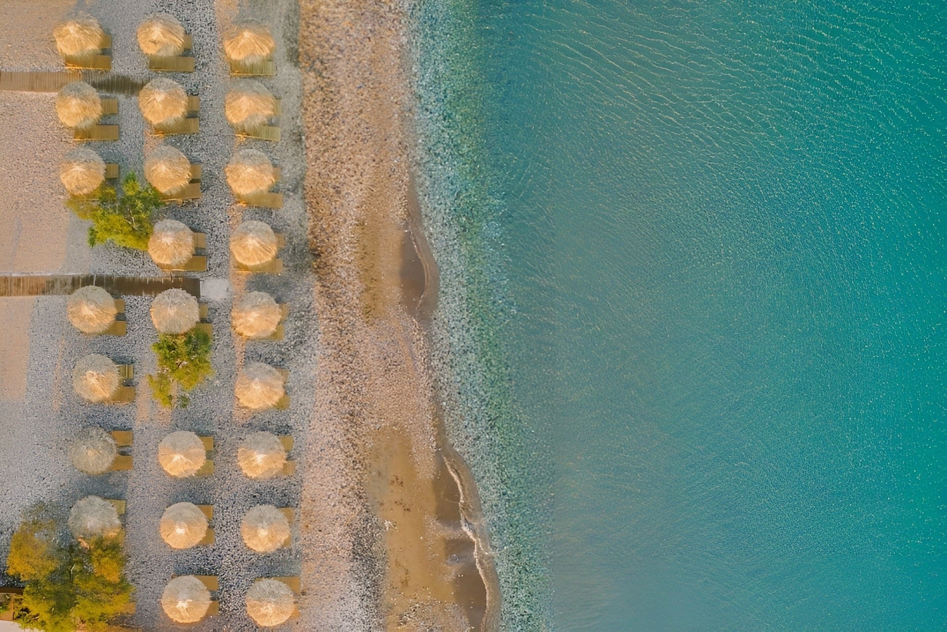 Pobřeží je pokryto oblázky a nabízí lehátka a slunečníky zdarma. Plážový bar funguje na bázi placeného servisu, což přidává další komfort k relaxaci na slunci.