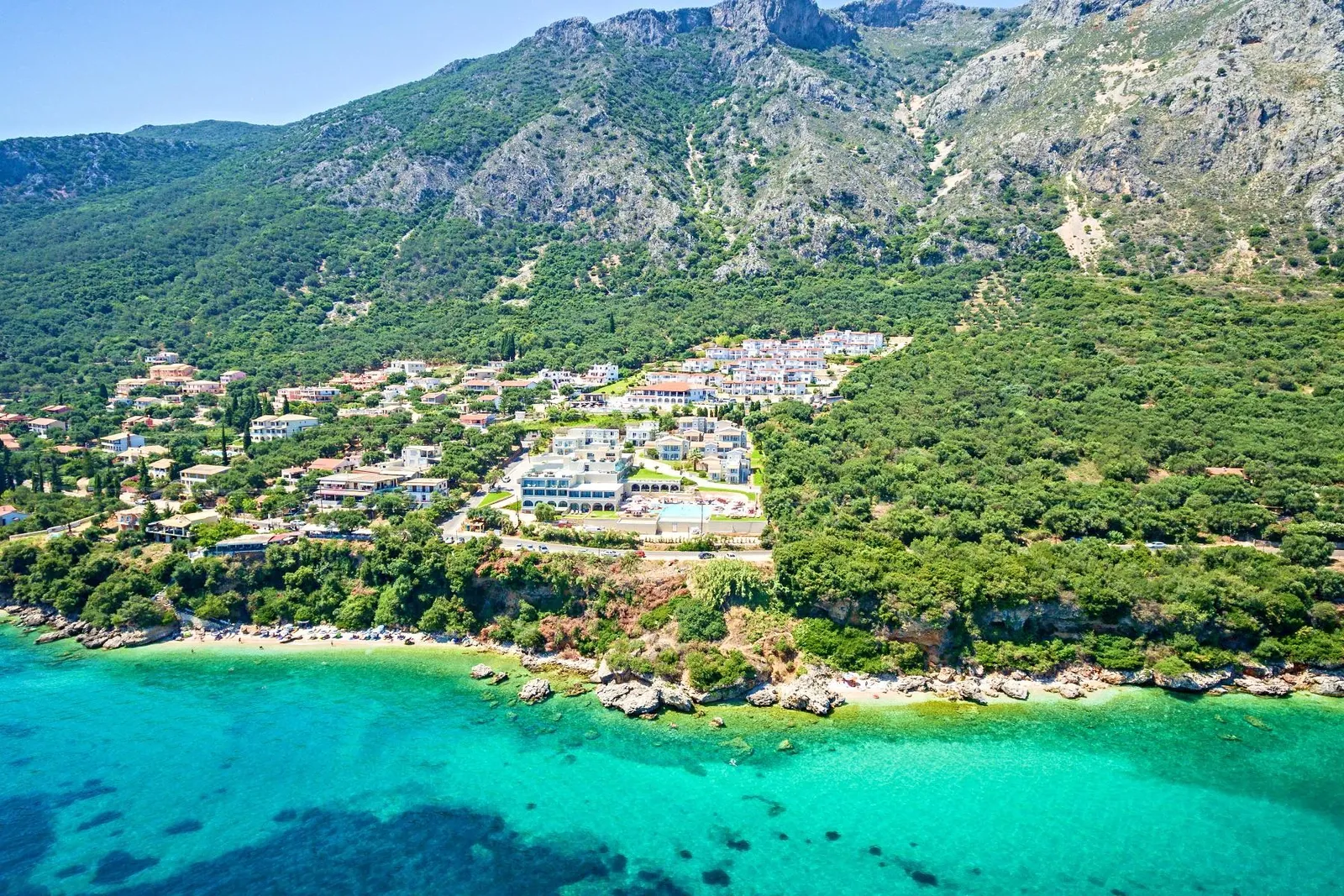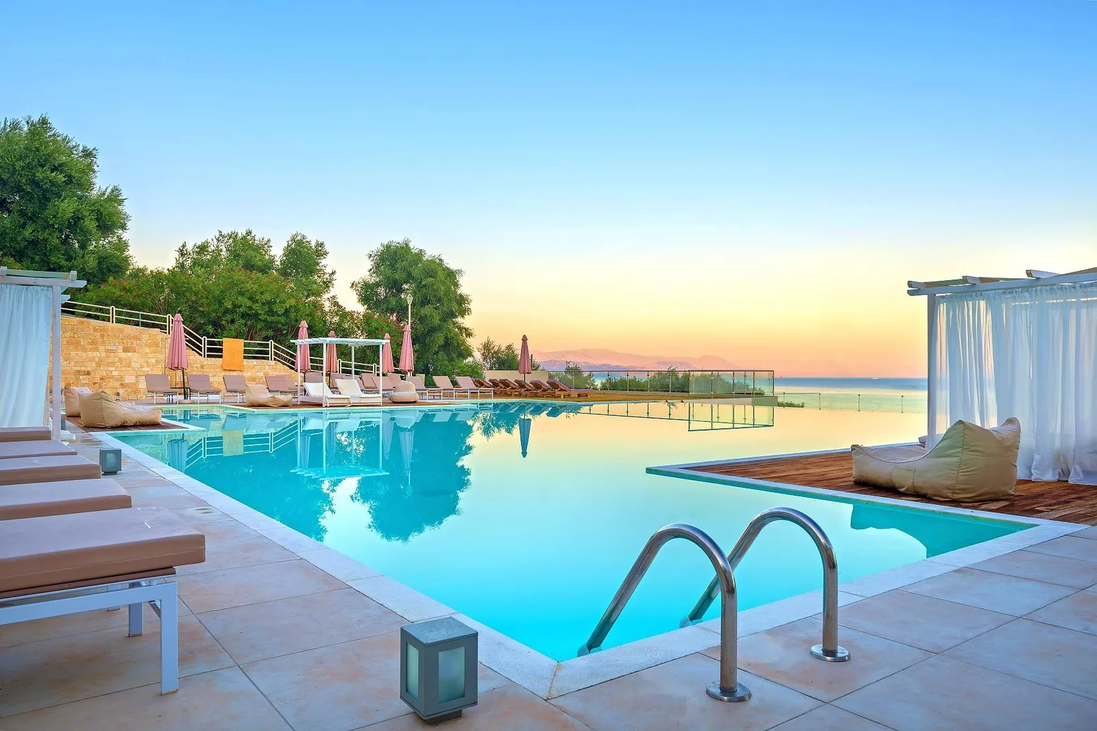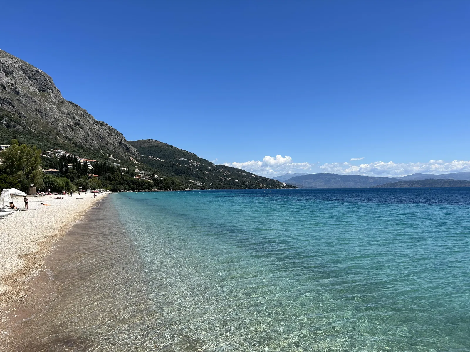 Najbližšia menšia piesočnato-oblázková pláž sa nachádza len cca 50 metrov cez cestu (vstup na pláž cez približne 90 schodov). Oblázková pláž Barbati je vzdialená približne 500 metrov od hotela a poskytuje lehátka a slnečníky za poplatok. Hotel zabezpečuje niekoľkokrát denne bezplatný minibus na hlavnú pláž. Plážové osušky sú k dispozícii za deposit približne 10 €.