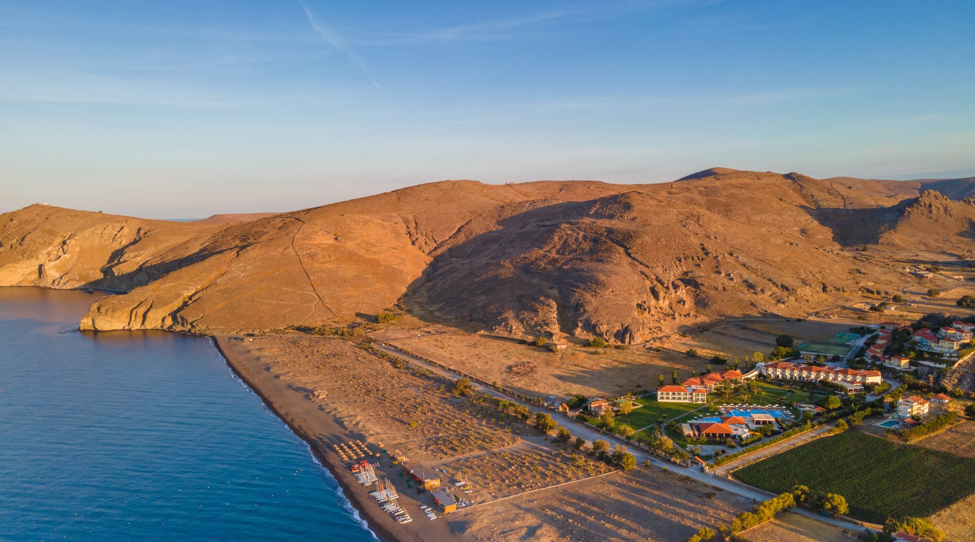 Hotel Aeolian Village Beach Resort sa nachádza na západnom pobreží ostrova Lesbos, v blízkosti malebného mesta Skala Erresos. Ak si chce návštevník vychutnať kulinárske špeciality alebo nezabudnuteľnú atmosféru miestnych barov a obchodov, má to na dosah ruky, keďže najbližšie reštaurácie a obchody sú vzdialené asi 1 kilometer od hotela. Letisko je situované zhruba 95 kilometrov od zariadenia, čo môže ovplyvniť čas príchodu, ale výhľady a atmosféra stoja za to.