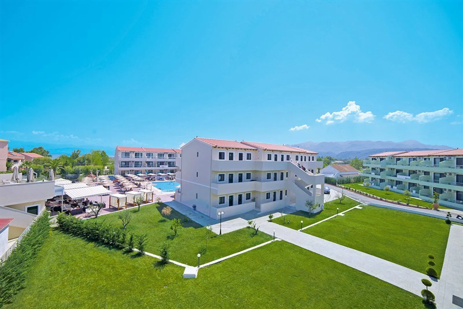 Hotel Angela Beach je rozľahlý komplex viacerých budov situovaný na severnej časti ostrova. Nachádza sa približne 3 km od známeho letoviska Roda, pričom hostia môžu využiť bezplatný hotelový autobus na dopravu. Acharavi je vzdialená asi 6 km a letisko približne 36 km. Počas pobytu majú hostia možnosť navštíviť obchody a reštaurácie, ktoré sú dostupné len 150 metrov od hotela.