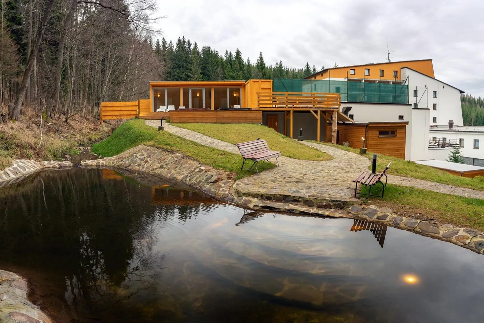 Hotel disponuje reštauráciou a barom, vonkajšou terasou a ďalšími terasami na oddych. Športové zázemie: Hostia môžu využívať vnútorný vyhrievaný bazén, malý whirlpool, telocvičňu pre halové športy so športovým vybavením, profesionálnu posilňovňu, bowling a stolný tenis. Medzi najnovšie pridané služby patrí wellness komplex, ktorý ponúka vnútornú aj vonkajšiu časť s celoročnou prevádzkou. Vnútorne sú k dispozícii whirlpool, jacuzzi, parná a fínska sauna, zatiaľ čo vonkajšia časť obsahuje bio saunu, vírivku a jedinečné prírodné ochladzovacie jazierko umiestnené priamo v lese, spolu s odpočivárňou a masážnymi službami. Pre deti je tu lanové centrum, detské ihrisko, trampolína, vonkajšie atrakcie, workout ihrisko a ohnisko. Dostupné sú aj požičovne horských bicyklov, WiFi a hotelový výťah.