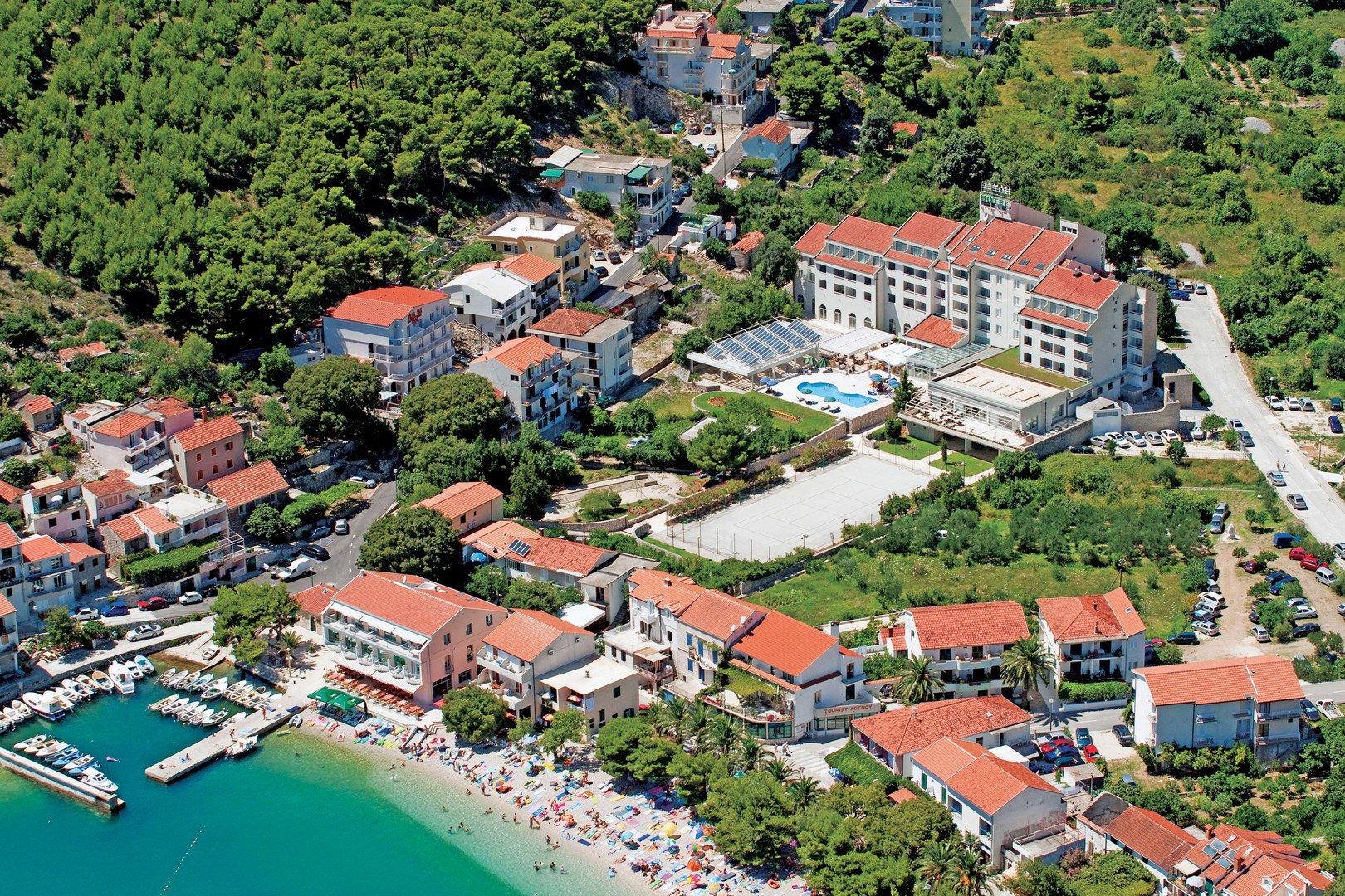 Hotel Quercus sa nachádza v srdci malebného rybárskeho mestečka Drvenik, ktoré leží v južnej časti známej Makarskej riviéry. Mesto ponúka široký výber obchodov, zmenární, reštaurácií a barov, čo je ideálne pre turistov, ktorí hľadajú komfort a zábavu. Drvenik sa môže pochváliť krásnymi kamienkovými plážami, tieňom borovíc a napriek svojej obľúbenosti poskytuje aj príjemné miesto na relaxáciu. Navyše, z Drvenika sú dostupné trajektové výlety na blízky ostrov Hvar, čo otvára možnosti na objavovanie ďalších krás Dalmácie.