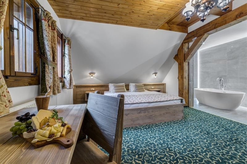 - Dvojlôžková izba Superior s vaňou - izba s manželskou posteľou a rozkladacím gaučom, kúpeľňa s vaňou, WiFi pripojenie, TV, minichladnička a kávový a čajový servis.