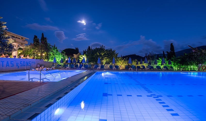 3 budovy, vstupná hala s recepciou, reštaurácia. Vonku bazén, bar pri bazéne, snack bar, terasa s lehátkami a slnečníkmi zadarmo.