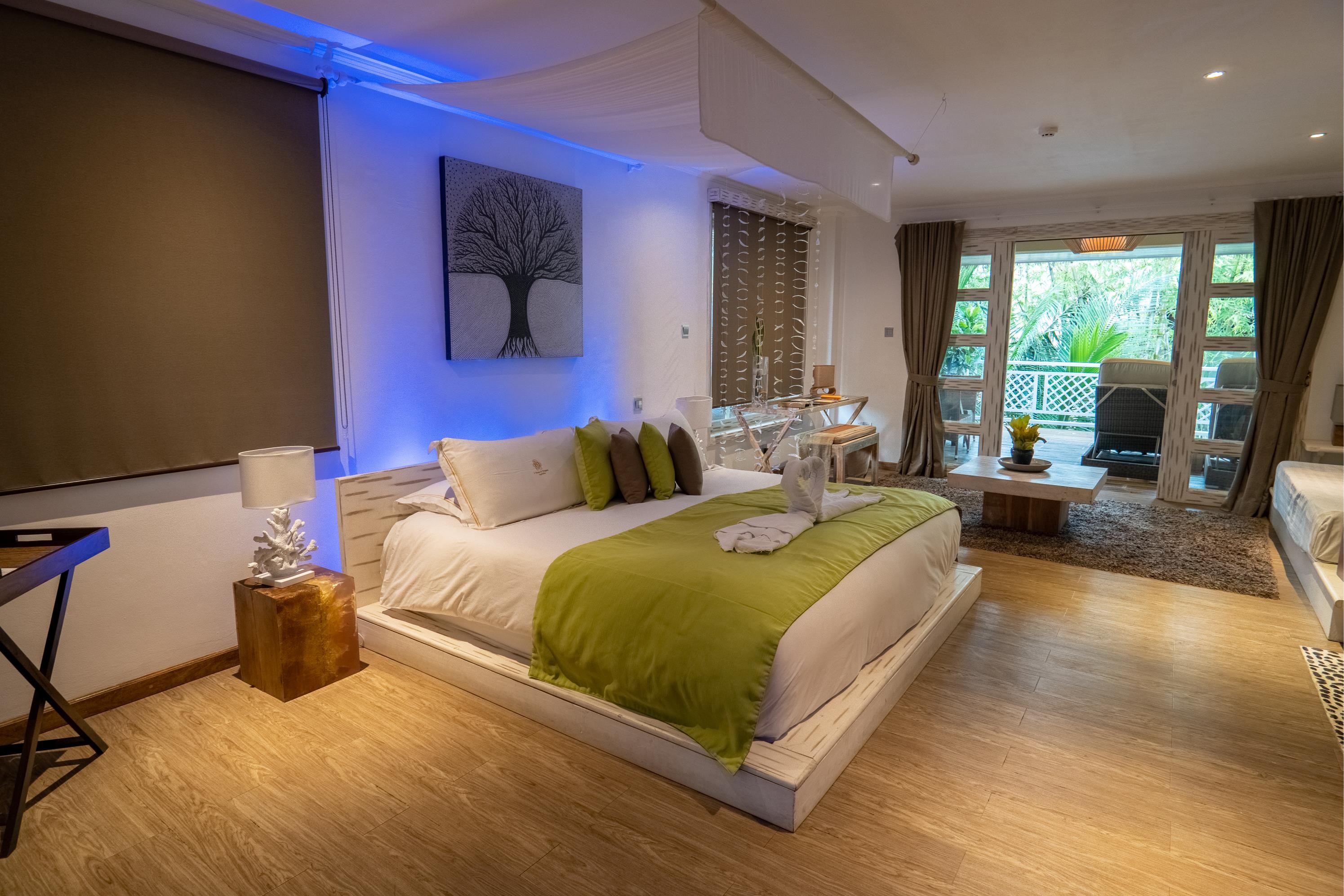 Pokoje typu Villa Garden jsou vybaveny venkovní koupelnou, obývací částí s TV/SAT, kávovarem, trezorem, klimatizací, ventilátorem, telefonem a WiFi připojením. Každý pokoj dostává dvakrát denně zdarma lahev vody, a navíc má terasu nebo balkon.