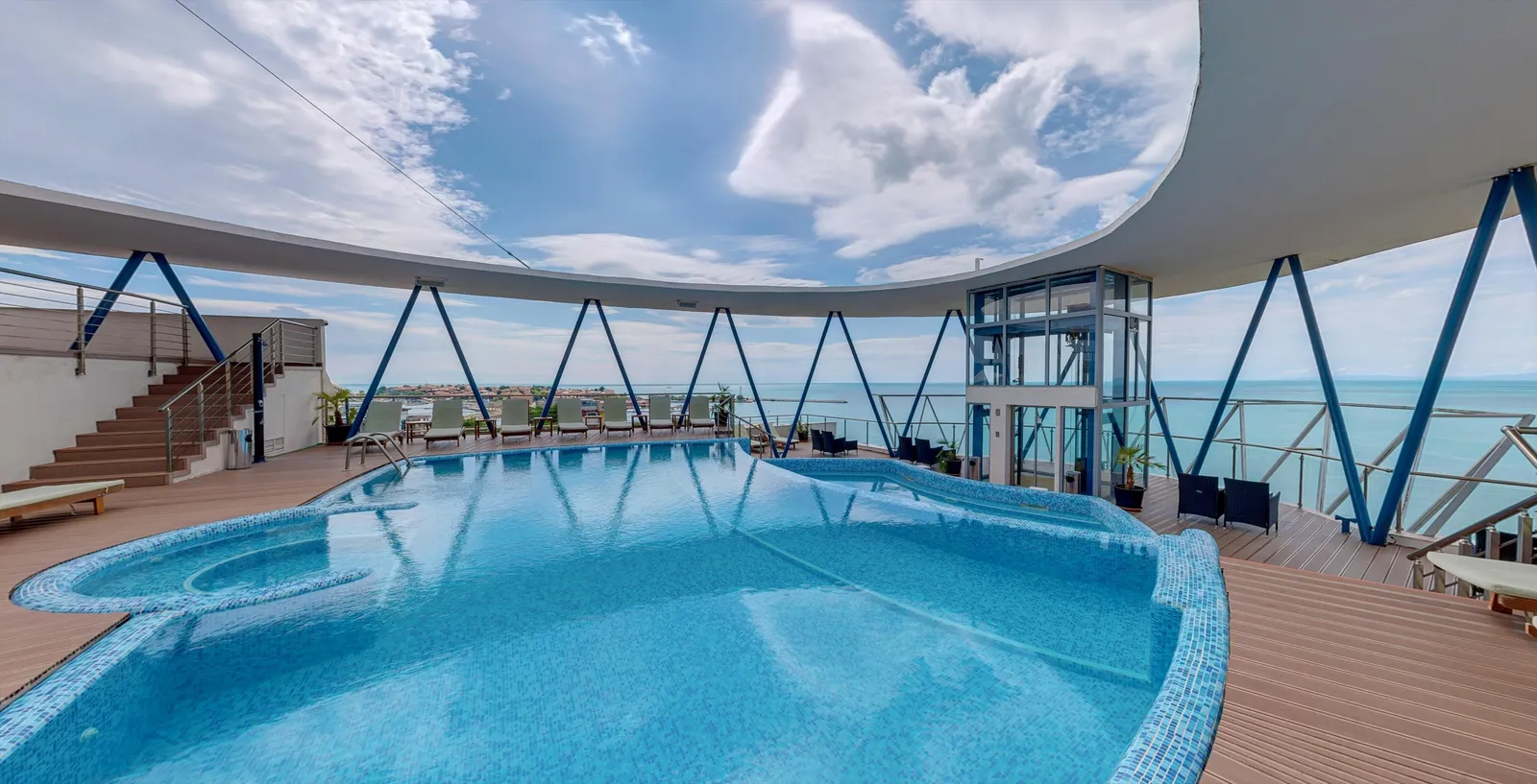 - Na streche sa nachádza menší bazén, vírivka, Sky bar a terasa s nádherným panoramatickým výhľadom — lehátka a osušky sú k dispozícii zdarma.