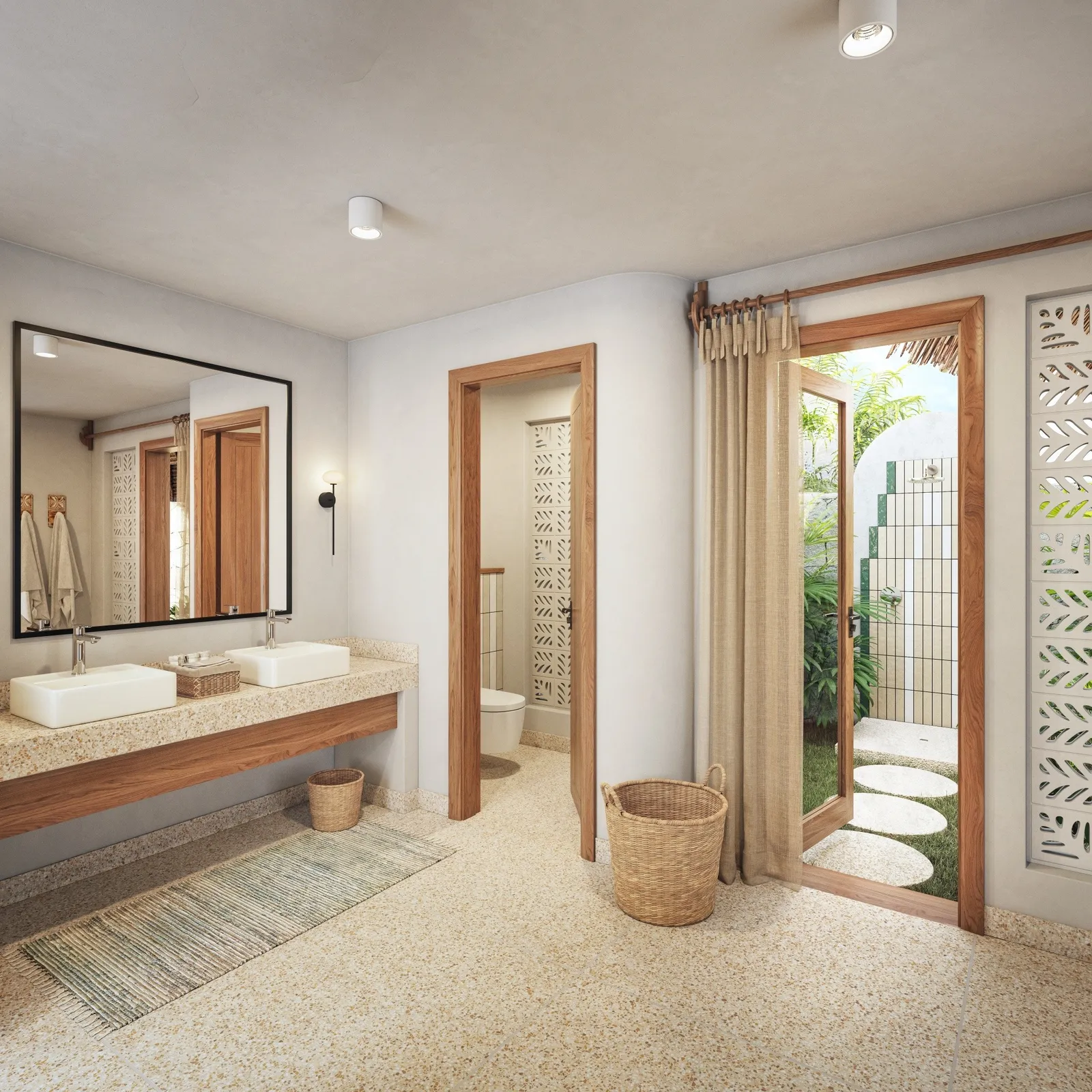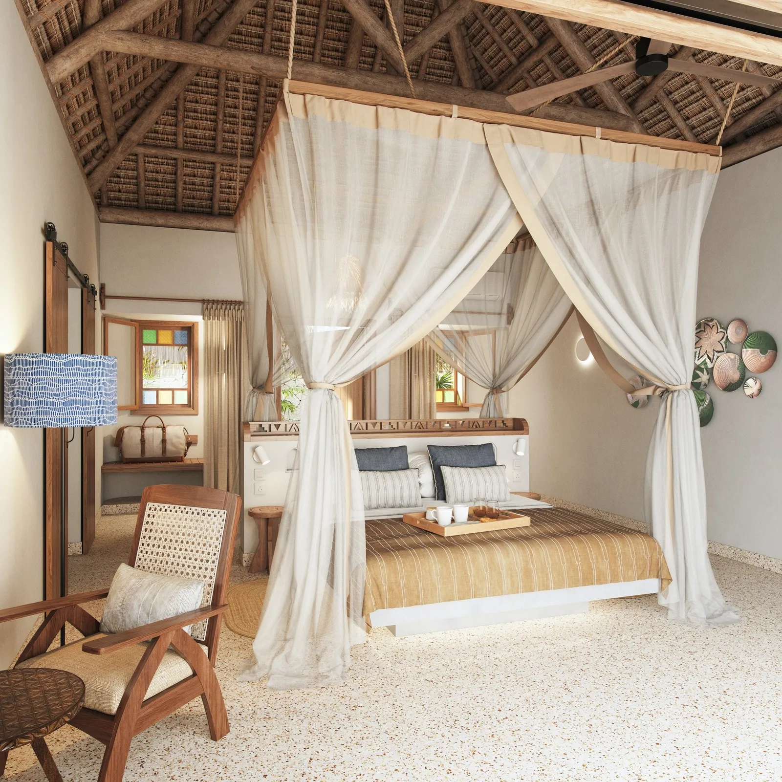 - Swim-up Vila: 74 m², manželská postel (king size), priamy vstup do spoločného infinity bazénu.