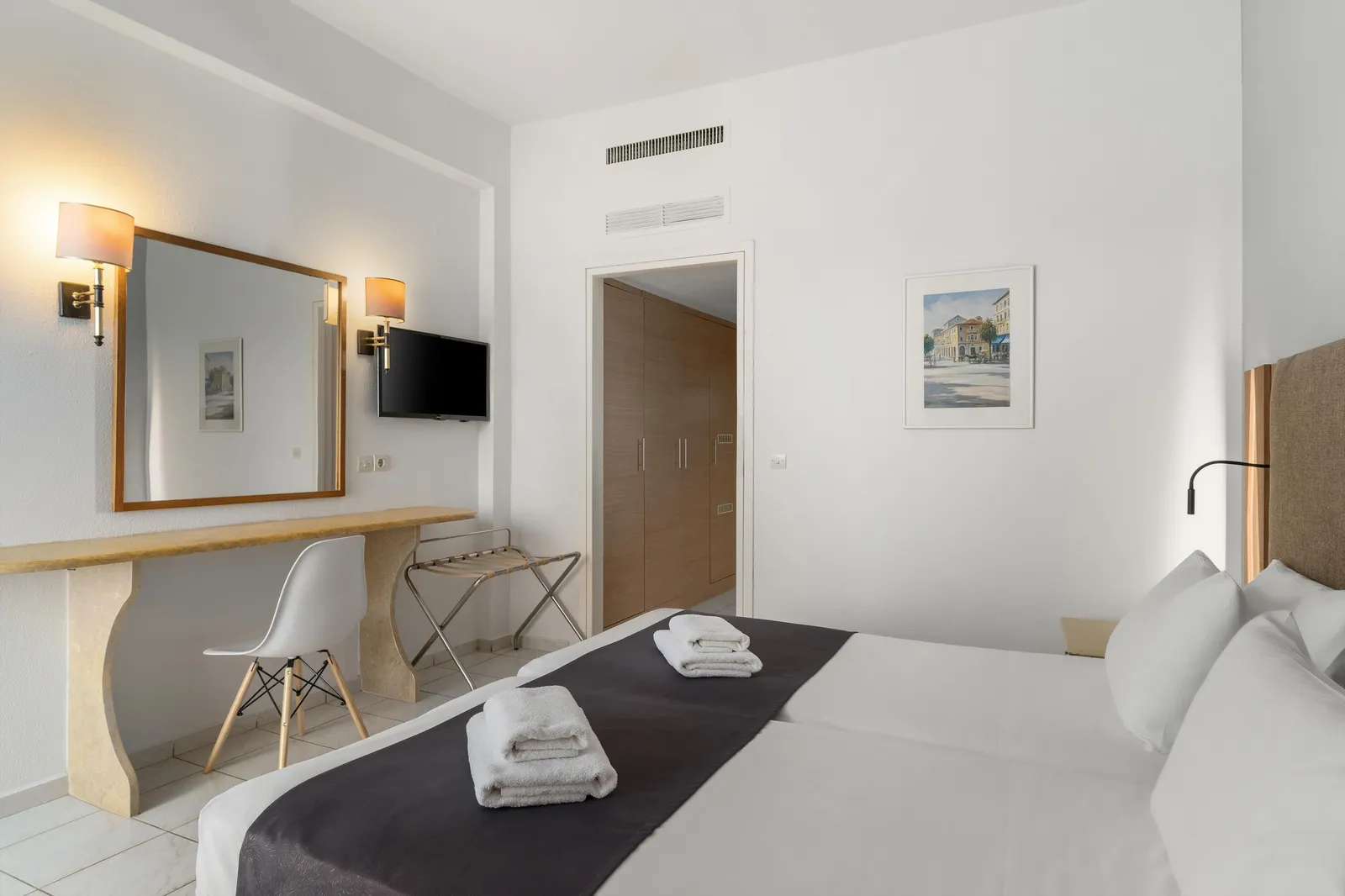 - Dvoulůžkový pokoj, Výhled zahrada: klimatizácia, televízia/sat., telefón, Wi-Fi (zdarma), mini-chladnička (zadarmo), kúpeľňa s WC a fénom, trezor, a balkón s výhľadom do záhrady.