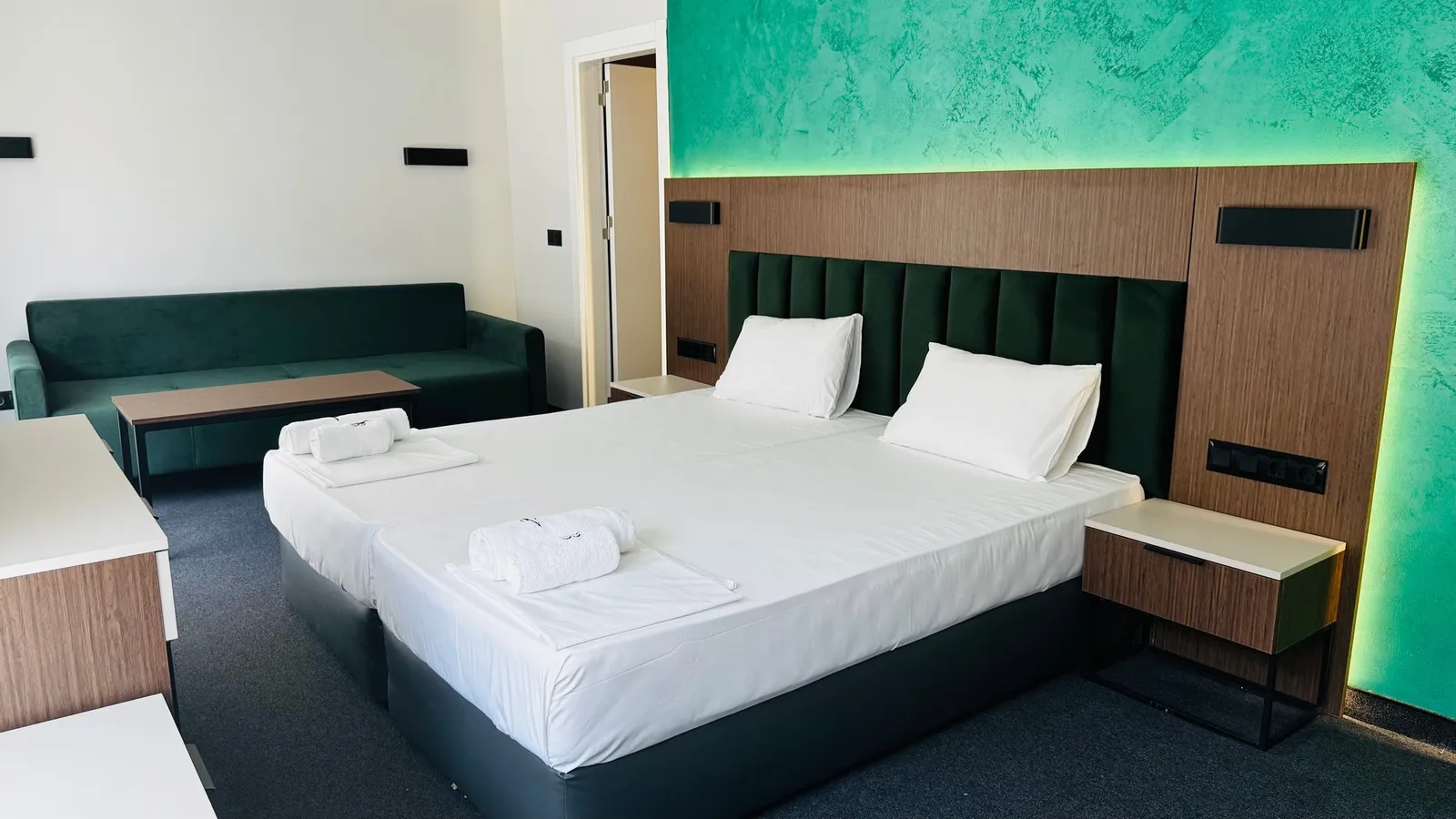 Izby typu Deluxe sú dvojlôžkové a ponúkajú individuálnu klimatizáciu, televíziu, bezplatné Wi-Fi, minichladničku, telefón, kúpeľňu so sušičom vlasov a balkón, čo zaisťuje pohodlie hosťom. Okrem toho sú k dispozícii aj priestranné štúdiá Deluxe s kuchynkou, ako aj apartmány s jednou spálňou a oddelenou obývacou časťou. Bezplatná detská postieľka je tiež na vyžiadanie.