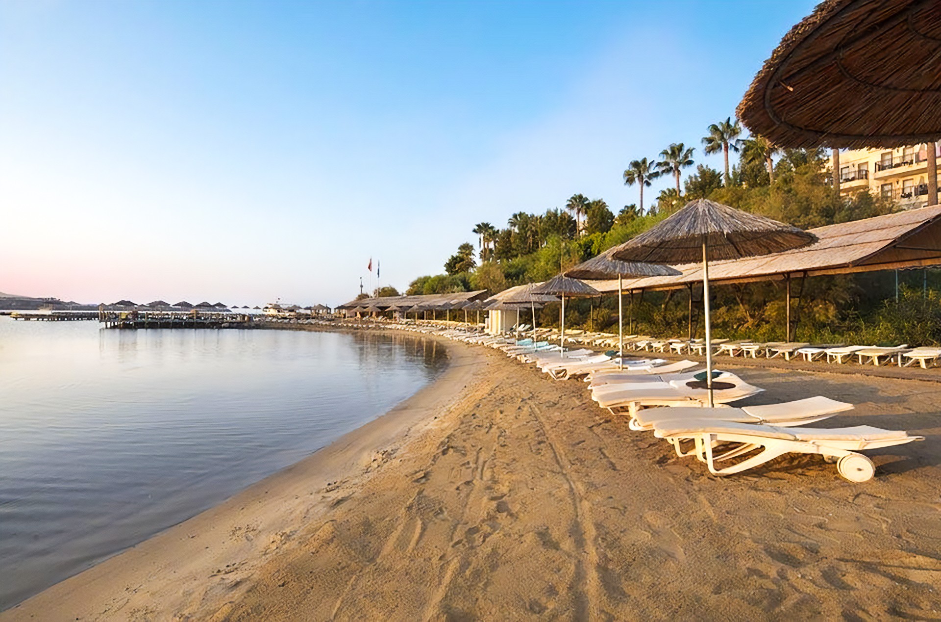 Písečno-oblázková pláž se 3 moly přímo u resortu. Lehátka a slunečníky zdarma. Plážový bar (10.00-18.00 hod.). Jedno molo s pavilony za poplatek, ostatní dvě zdarma.
