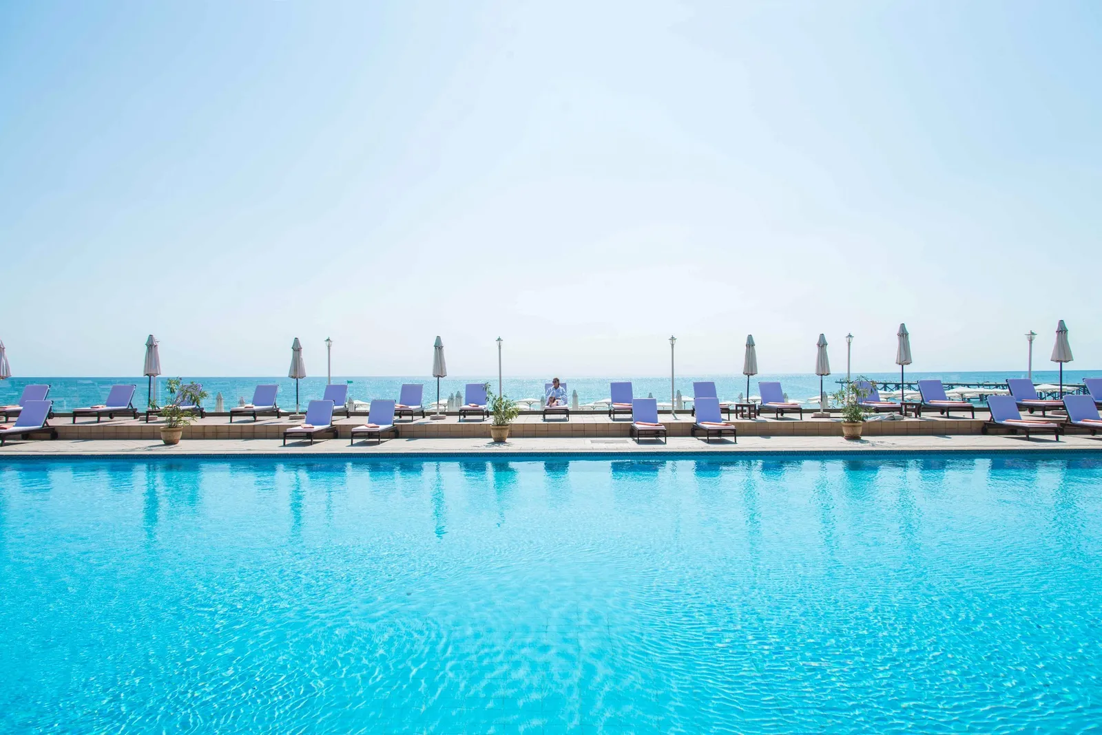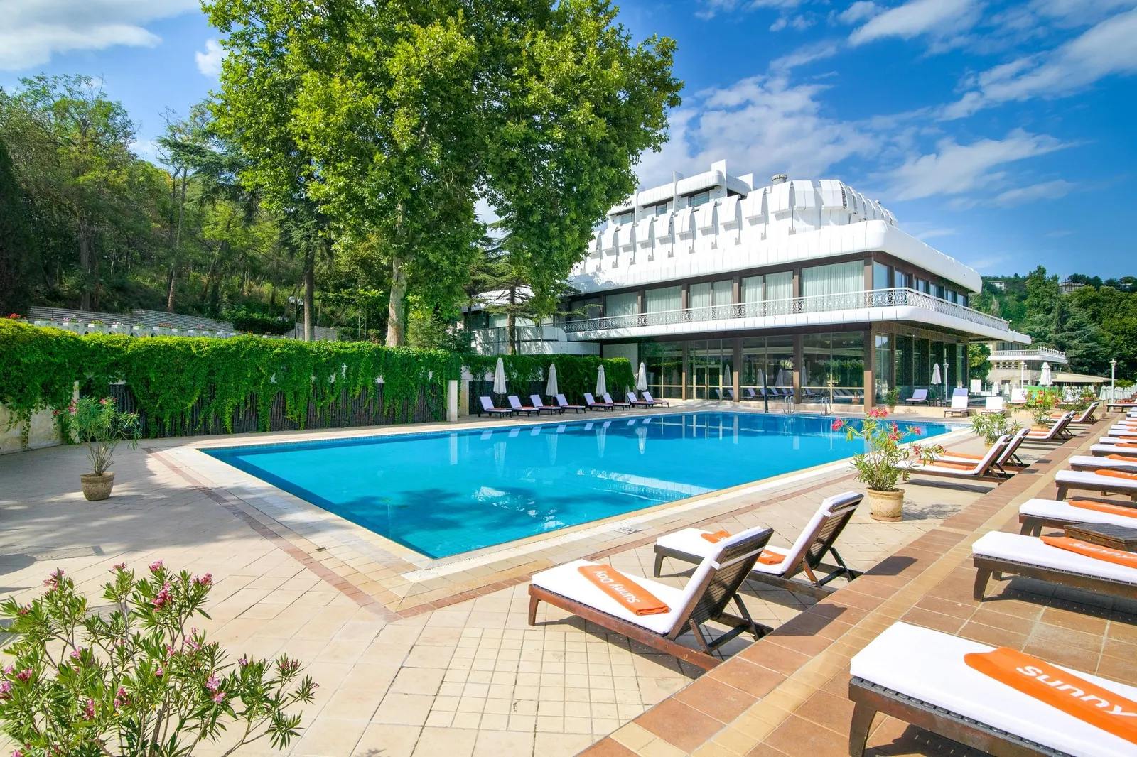 - Vonkajší bazén so slnečníkmi a ležadlami, ktoré sú zadarmo k dispozícii pre hostí
