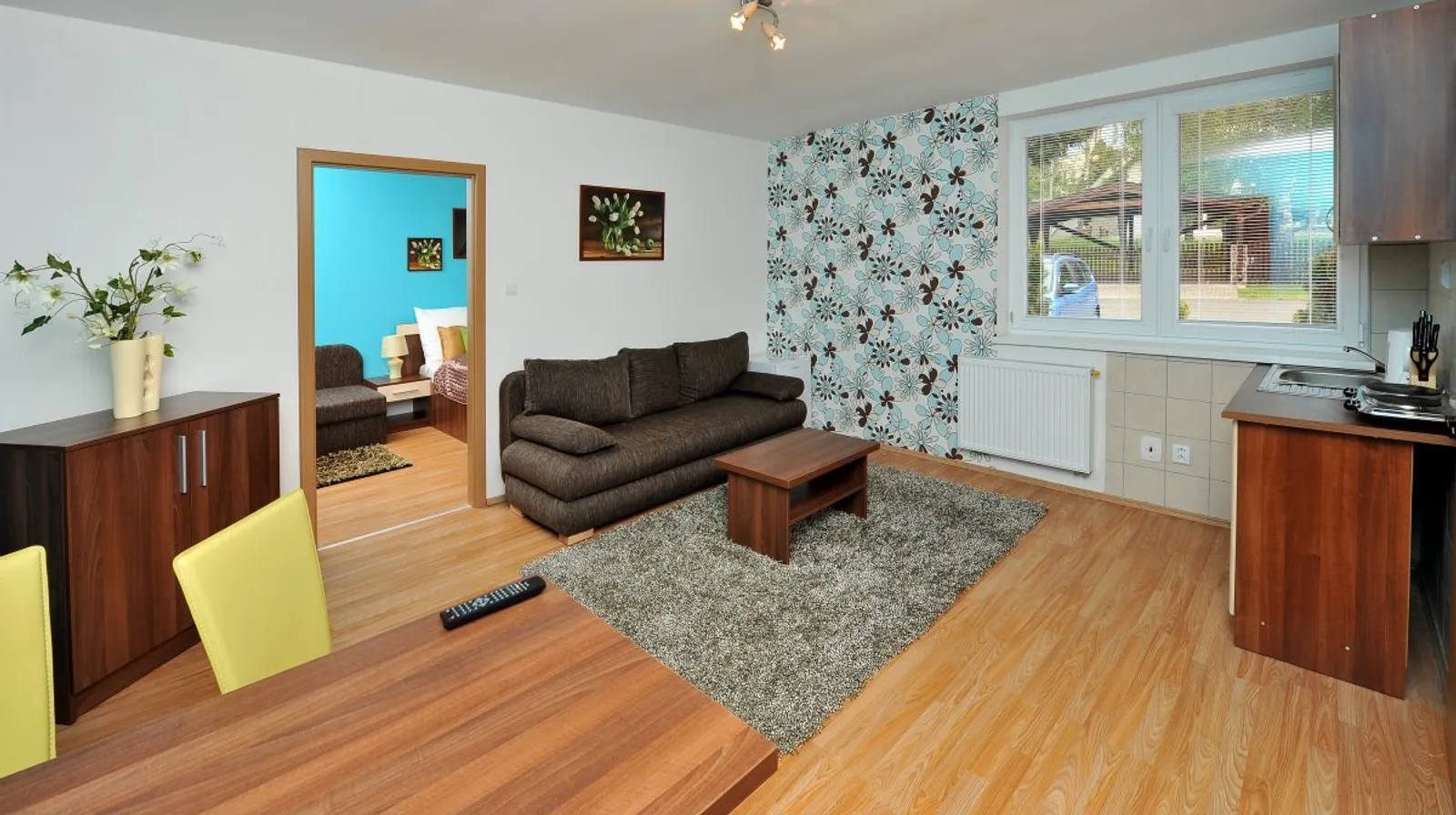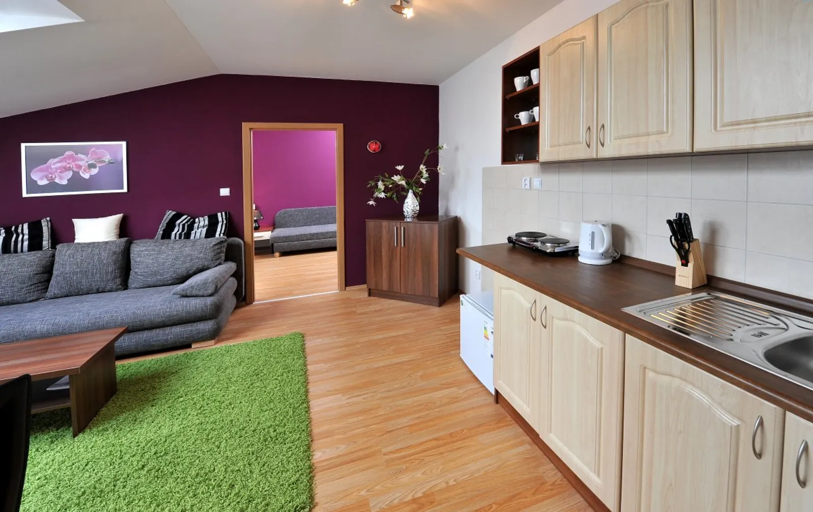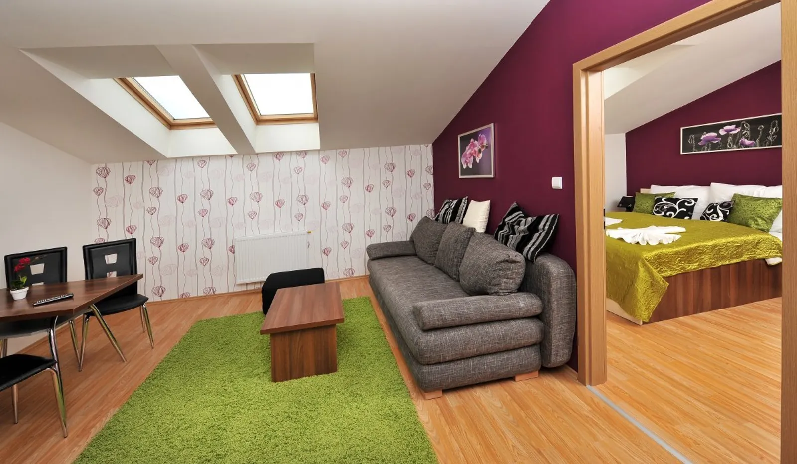 * Trojlôžkový apartmán s 2 prístelkami (typ A): pre 3-5 osôb, s obývacou izbou, TV a rozkladacou pohovkou pre 2 osoby, spálňou s manželskou posteľou a oddeleným lôžkom. Kuchyňa je vybavená chladničkou, dvojplatničkou, mikrovlnnou rúrou, varnou kanvicou a jedálenským kútom. Apartmán má kúpeľňu so sprchovým kútom a sociálnym zariadením. Rôzne farebné kombinácie v interiéri pridávajú na útulnosti, niektoré apartmány majú aj balkón.