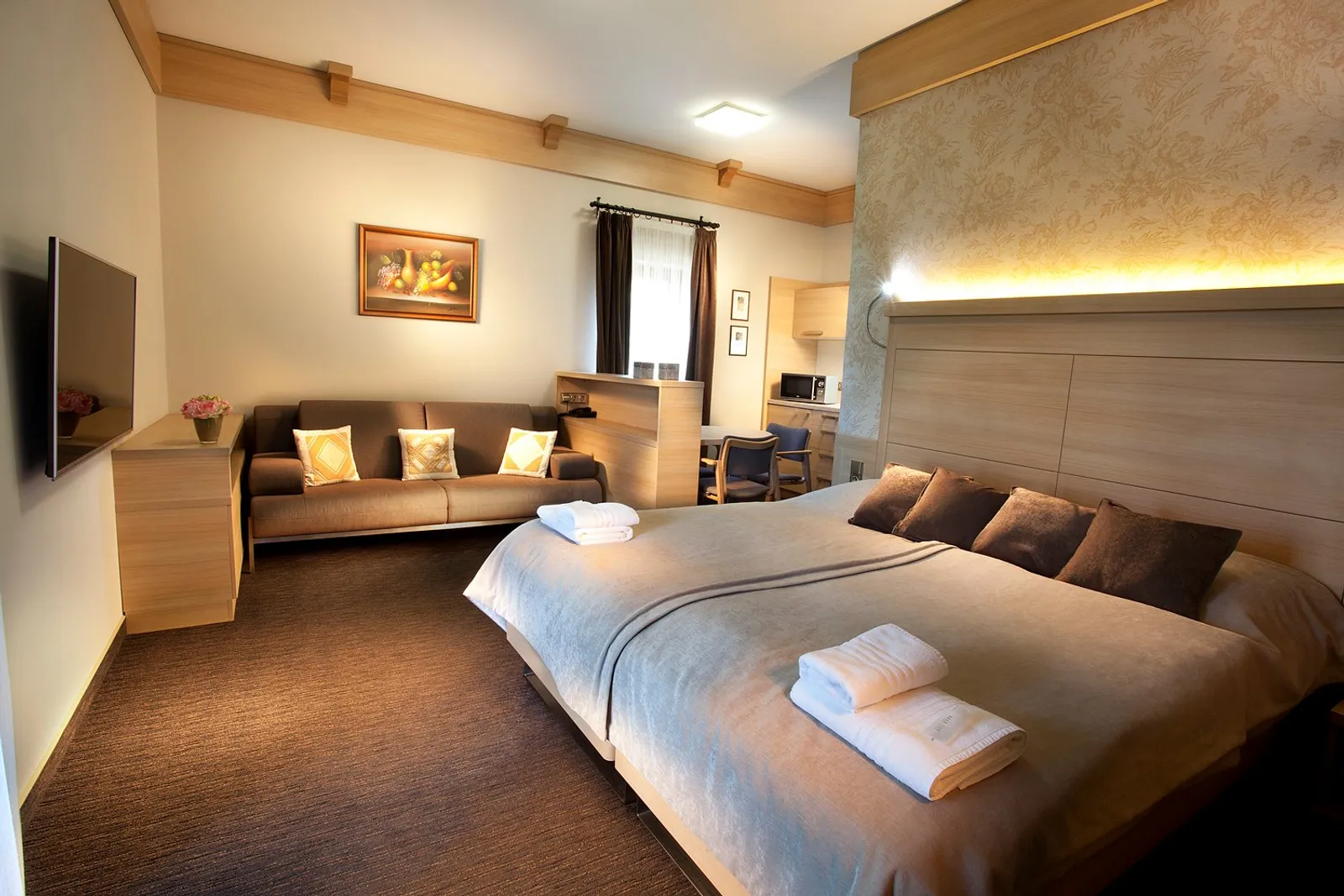 Penzión disponuje 11 dvojlôžkovými izbami, ktoré sú vybavené klimatizáciou, Wi-Fi, televízorom, telefónom, trezorom, minibarm a fénom. Na požiadanie sú dostupné aj bezbariérový izba, 2 štúdiá, 1 dvojlôžkový apartmán, 1 rodinná izba, 1 štvorlôžkový apartmán a 1 mezonetový VIP apartmán. V blízkosti penziónu sa nachádzajú aj apartmánové chatky s názvami Pálava, Agni a Aurelius.