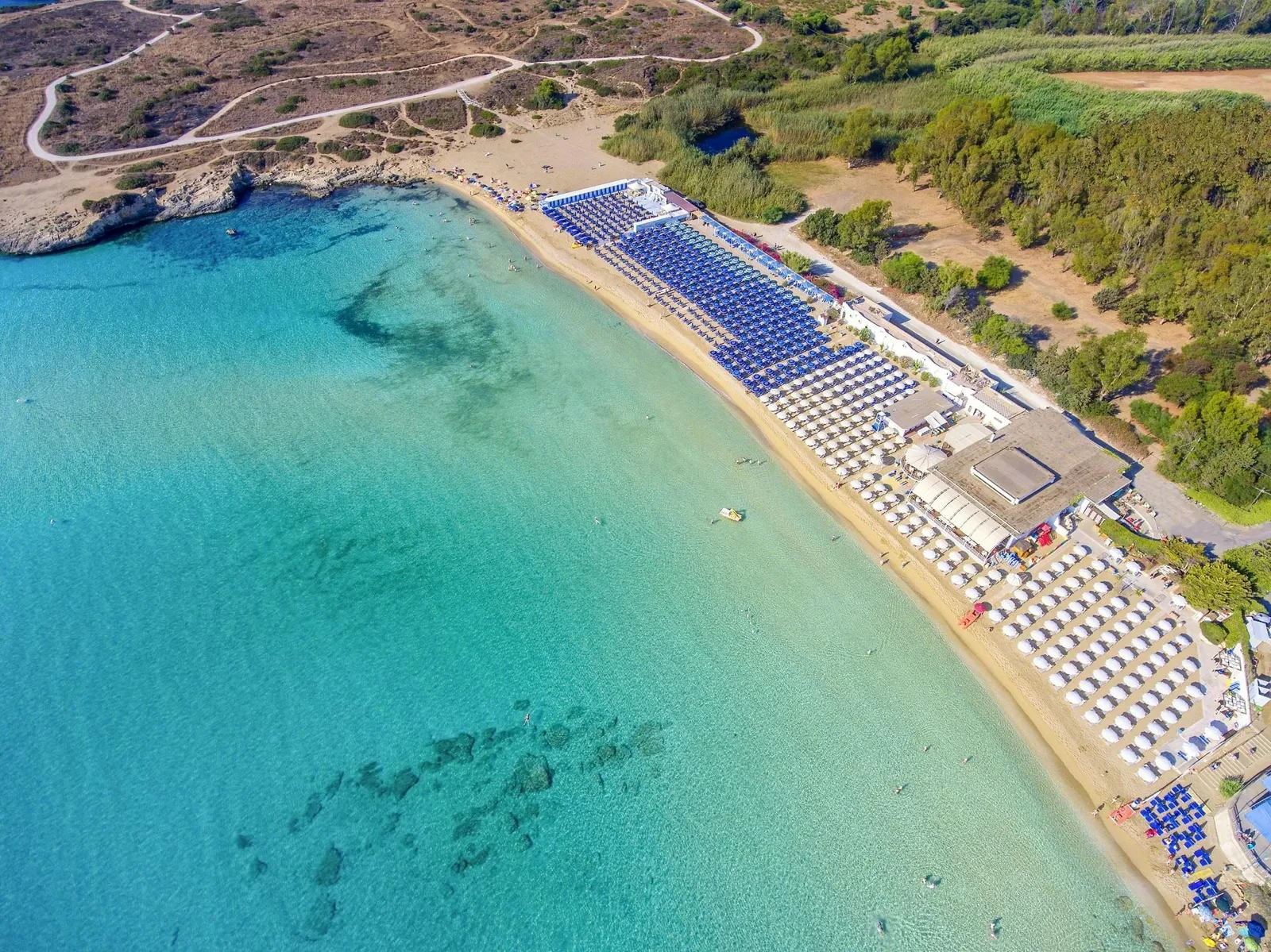 Piesočná pláž je dostupná cez park a hotelový vláčik, ktorý premáva zdarma medzi 09:00 a 19:00 a vzdialenosť pláže je približne 600 metrov. V blízkosti sa nachádza menšia skalnatá zátoka, ideálna na šnorchlovanie (asi 250 metrov) s prístupom z móla. Lehátka a slnečníky sú k dispozícii zdarma od tretej rady (2 lehátka a 1 slnečník na izbu, podľa dostupnosti).