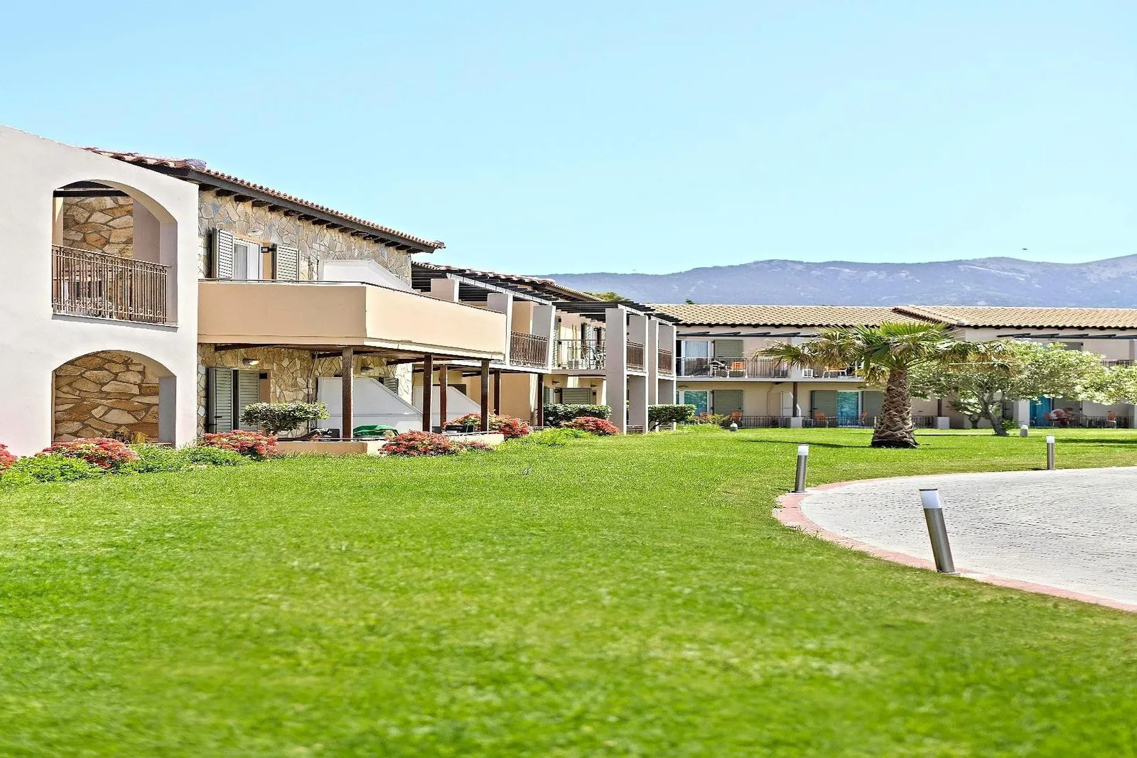 Úzka pláž s hrubým pieskom sa nachádza priamo pod hotelom, pričom vstup do mora je štrkovito-kamenistý alebo po kamennom plate (odporúčajú sa topánky do vody). Dlhá piesočnatá pláž Karnagio so pozvoľným vstupom do vody je len 5 minút pešo od rezortu.